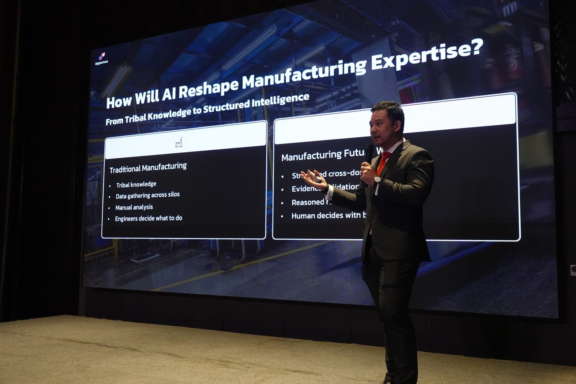 Appomax ได้ใช้เวทีนี้ในการเปิดตัวเทคโนโลยี Digital Twin แทนที่จะเป็นเพียงการจำลองโมเดลเสมือนของวัตถุชิ้นเดียว แต่เน้นการสร้างระบบนิเวศของฝูงข้อมูล ที่เชื่อมโยงกันแบบ Real-time