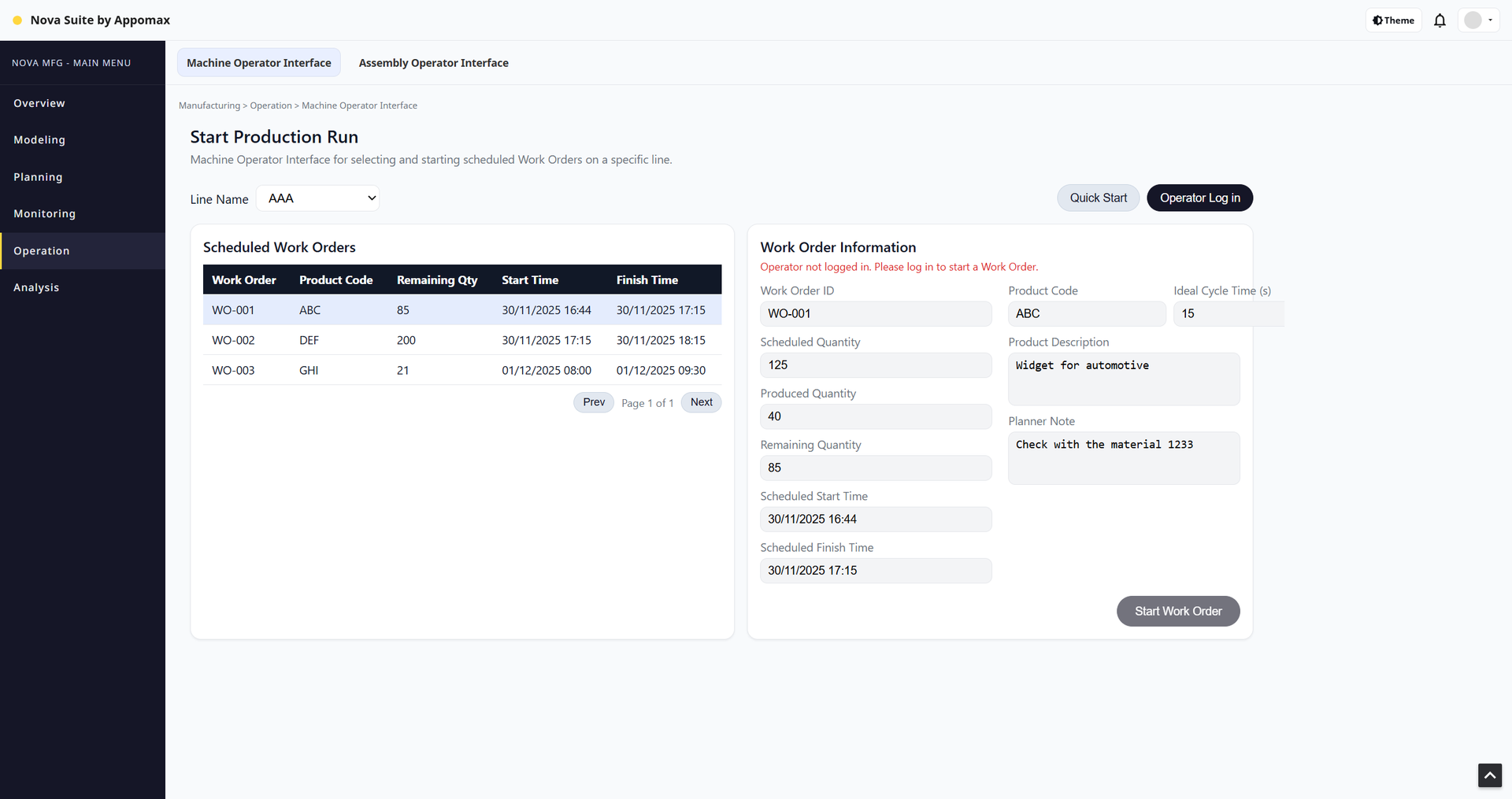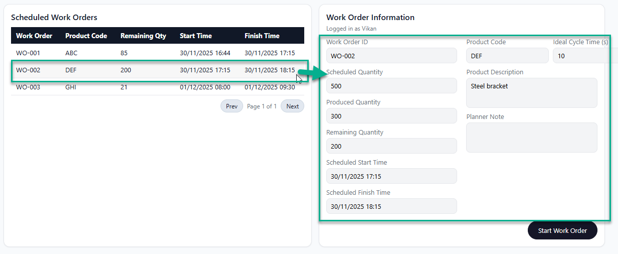 Scheduled Production Run — selecting from a list of pre-planned Work Orders.