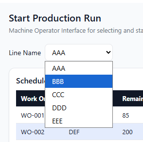 The Start Production Run page is the operator-facing interface for initiating a production run on a selected production line. It supports two distinct workflows: