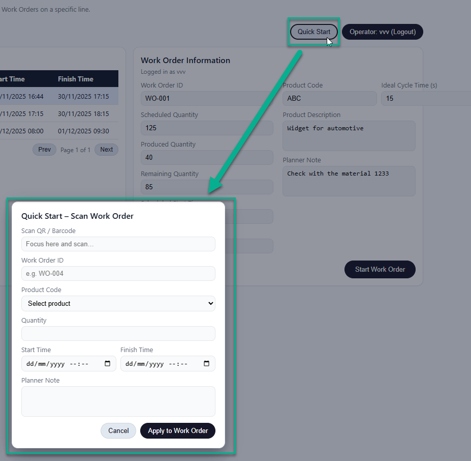Quick Start (Ad-hoc Production Run) — creating an ad-hoc Work Order + Schedule + Run using QR/barcode scanning or manual input, without modifying the scheduled list.