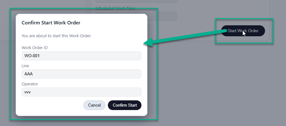 This is the script on the Confirm Start / Start Work Order button (onActionPerformed).