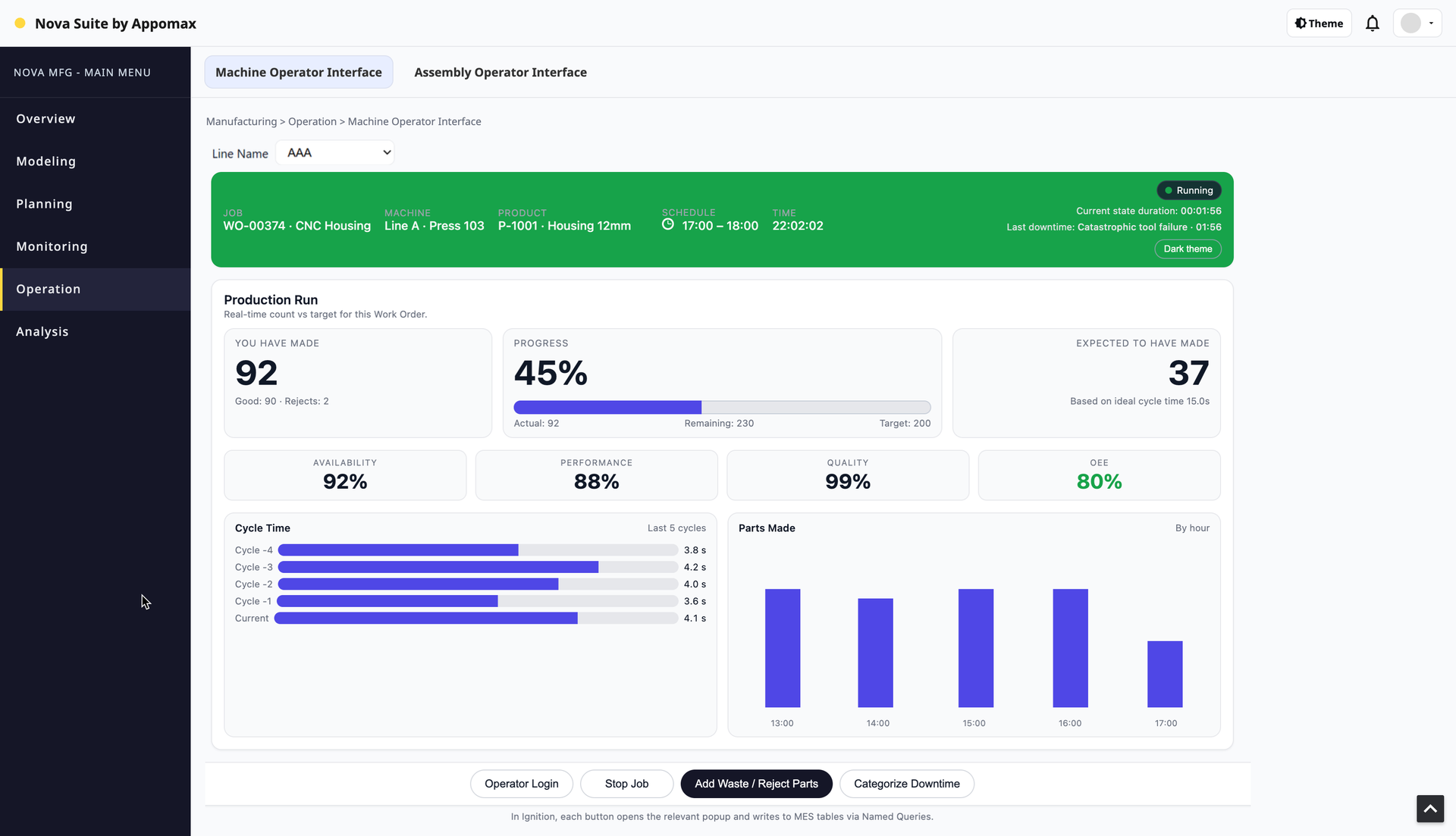 It displays up-to-date run context, production KPIs, OEE indicators, cycle-time behavior, hourly production trends, and operator actions (waste input, downtime categorization, run stop).