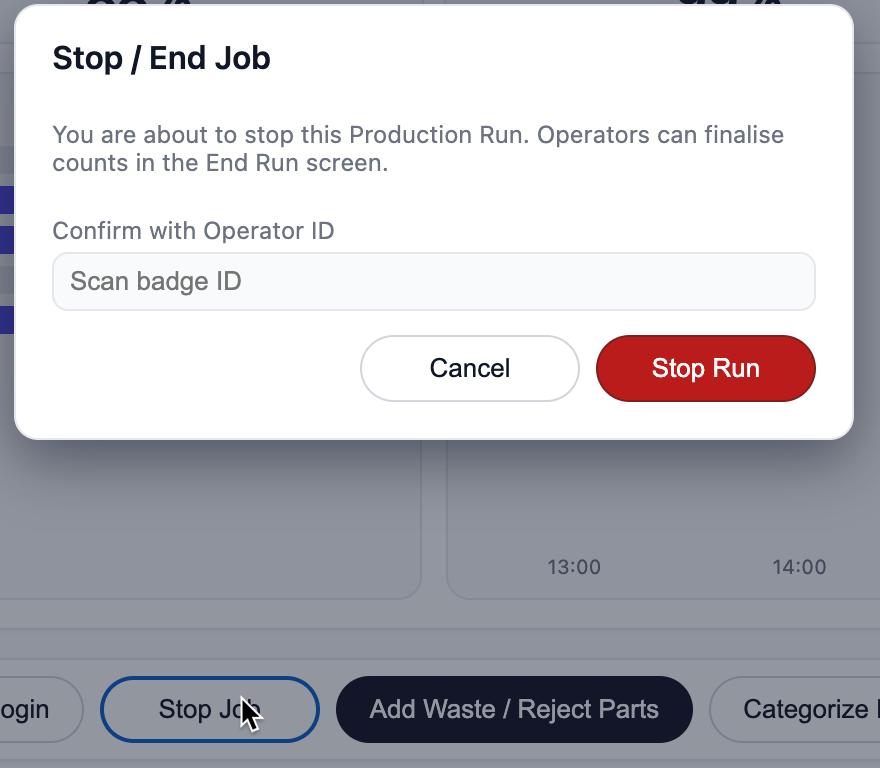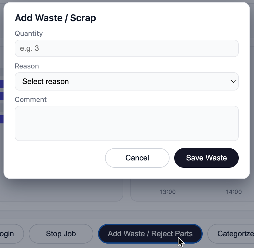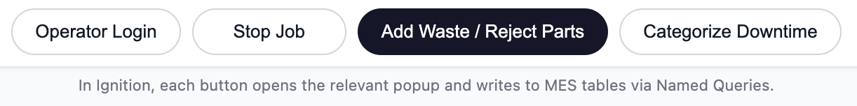 | Add Waste | Opens popup → writes values to UI_RunMonitor.Commands.Waste* tags → Dispatch UDT handles the DB insert + counter update |