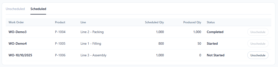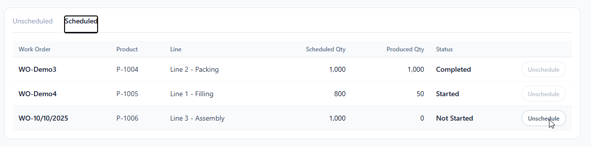 If unscheduled_qty = 0 → Work Order disappears from Unscheduled tab.