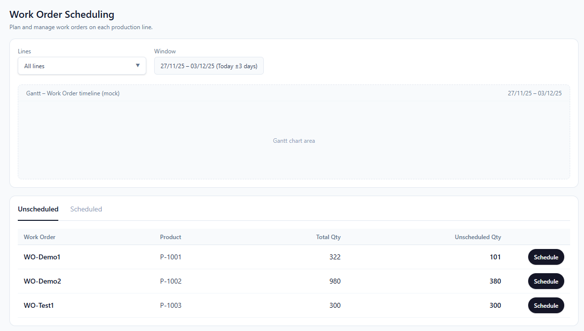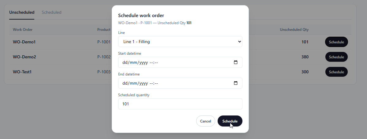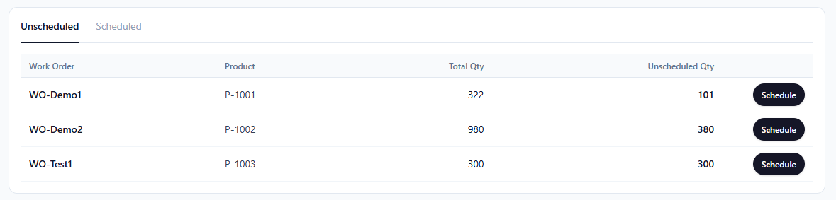 | Full Scheduling | Insert with qty = unscheduled_qty | WO disappears from Unscheduled |