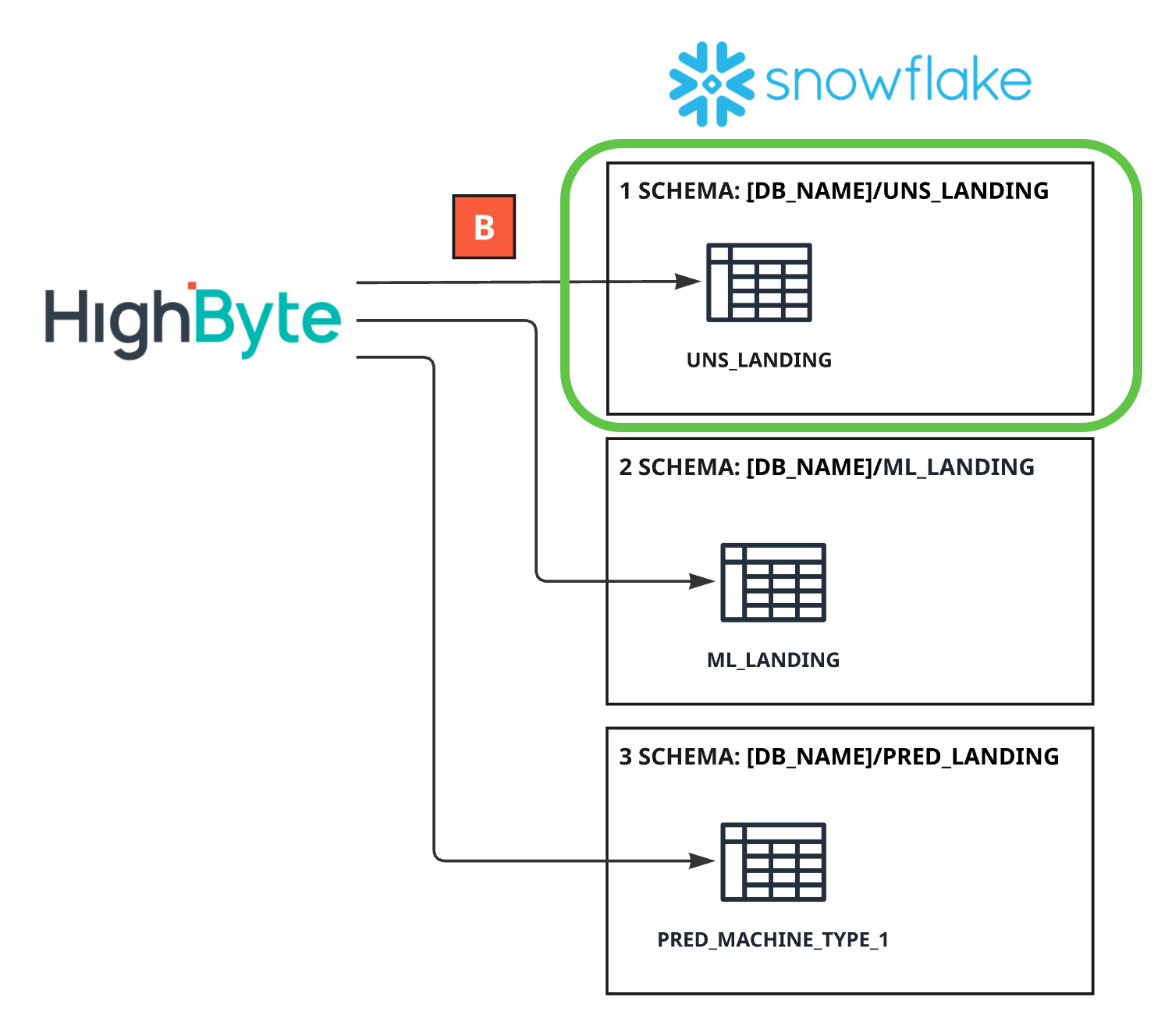The UNS_LANDING schema represents the raw, historical landing zone for contextualised OT data published by HighByte into Snowflake.